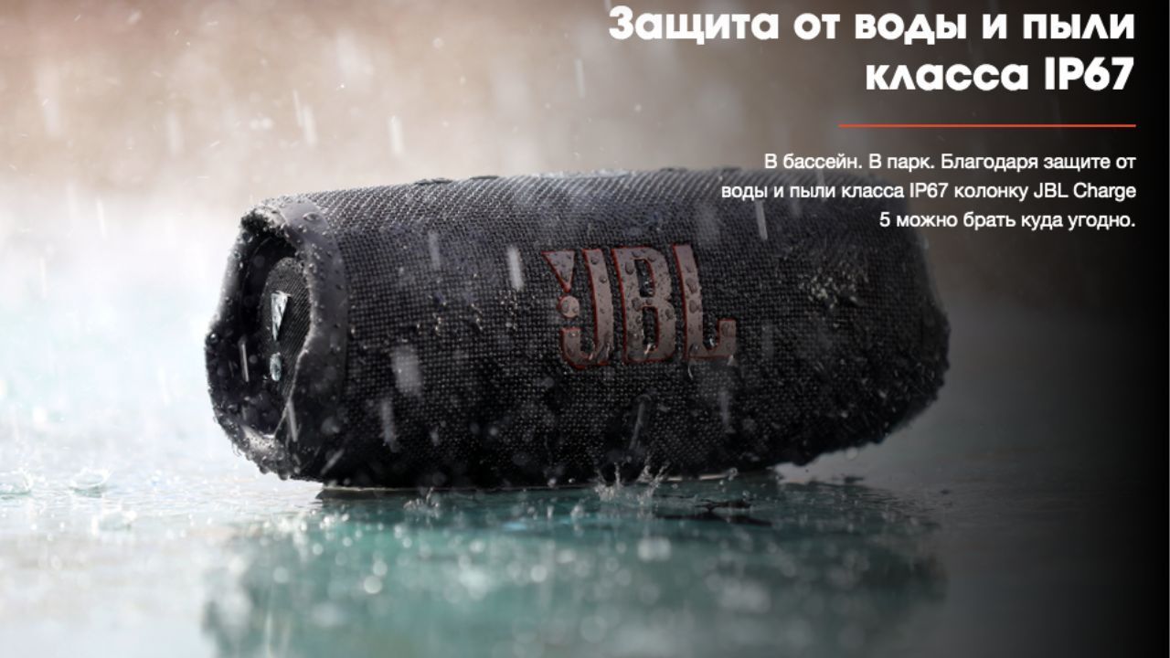 До 20 часов воспроизведения Незачем прекращать веселье. Благодаря возможности работать от батареи до 20 часов JBL Charge 5 позволяет веселиться день и ночь напролет. Защита от воды и пыли класса IP67 В бассейн. В парк. Благодаря защите от воды и пыли класса IP67 колонку JBL Charge 5 можно брать куда угодно. Беспроводное соединение по Bluetooth Подключай к колонке одновременно 2 смартфона или планшета и наслаждайся легендарным звуком JBL.