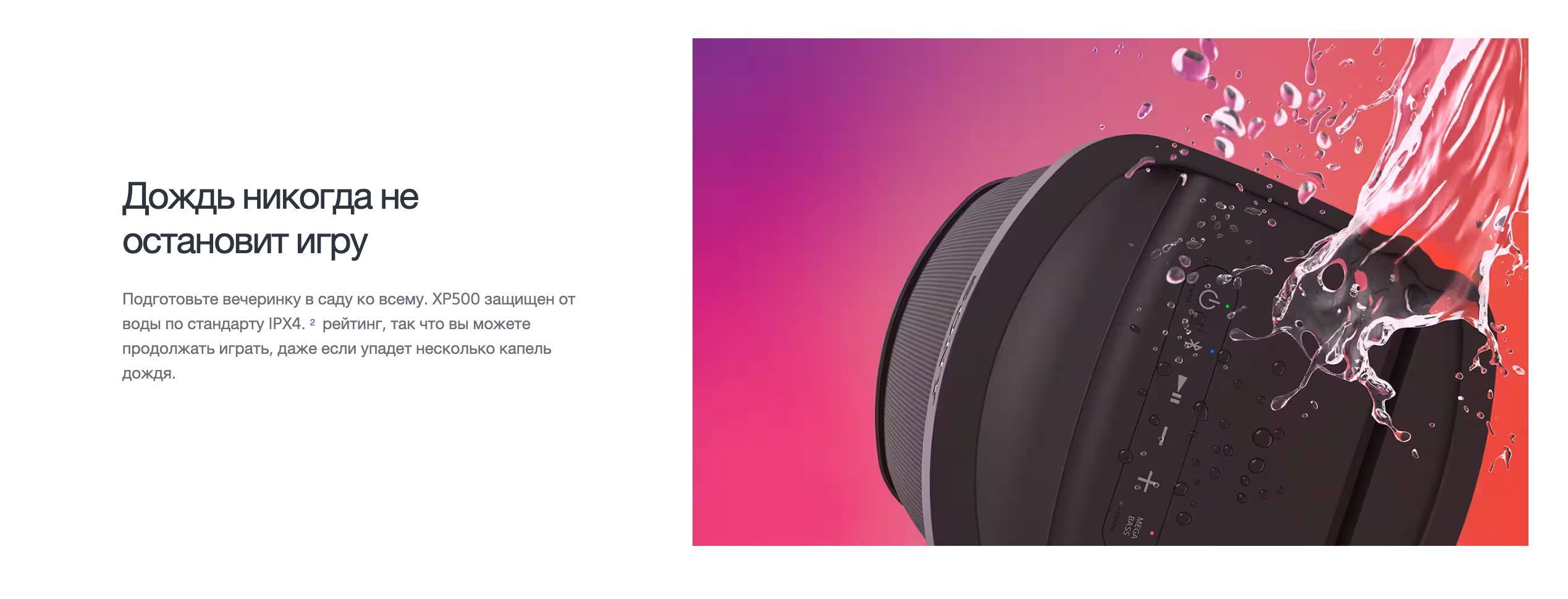 Дождь — не помеха вашей садовой вечеринке. XP500 имеет степень защиты от влаги IPX4, поэтому вы можете продолжать веселиться, даже если начнет моросить. - Быстрая зарядка.