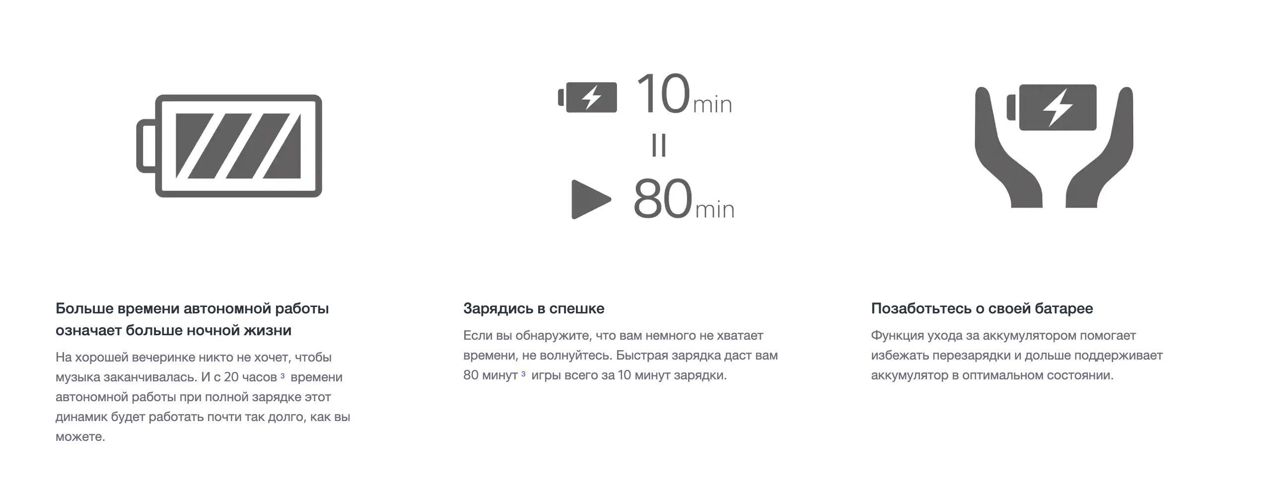 Если у вас нет достаточно времени для зарядки, не волнуйтесь. Всего 10 минут быстрой зарядки обеспечат 80 минут полноценной работы системы. - Чем больше часов автономной работы, тем больше веселья!