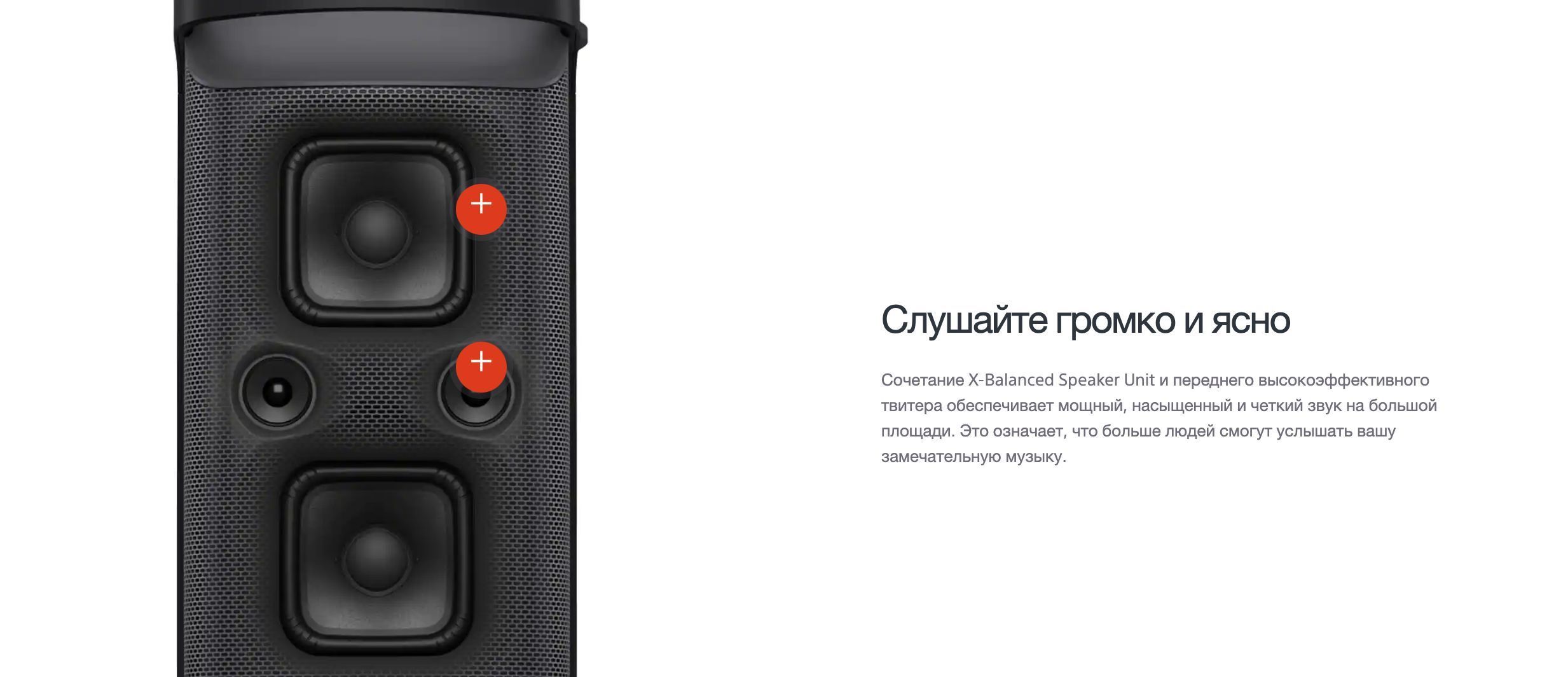 Комбинация динамика X-Balanced и высокоэффективного переднего ВЧ-динамика обеспечивает богатый, чистый и высококачественный звук. Это означает, что еще больше людей смогут насладиться вашей прекрасной музыкой. - Прокачайте басы.